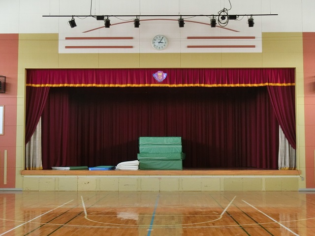 はじめに、一文字幕および校歌パネルについてです。中学校統合や新校舎建設に伴い、新興部中学校では、校章・校歌が新しくなりました。そのため、体育館ステージ正面の垂幕(一文字幕・校章付き)、校歌パネルが更新されています。校章については、興部町民から公募され、新中学校校舎整備等検討委員会により決定されました。校歌は、興部町出身の音楽関係者の方が製作をしています(写真④~⑥参照)。
